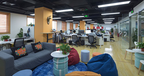 極客現(xiàn)代的裝修風(fēng)格作為主視覺——鮮明黃色和沉著黑色的墻面交錯分布,輕松活潑,搭配紅色、橙色沙發(fā)或椅凳,實用而不呆板。長廊右側(cè)以開放工位為主,空間寬敞,側(cè)面向陽的窗子使空間采光好。