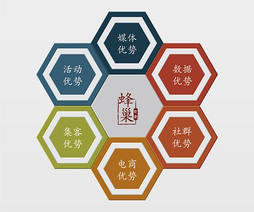 蜂巢計(jì)劃由媒體、活動(dòng)、聚合、社群、數(shù)據(jù)、電商六大基于大數(shù)據(jù)的產(chǎn)品組成一個(gè)六邊系統(tǒng)。我們希望這個(gè)系統(tǒng)能夠相互連通、相互滲透,再搭配大數(shù)據(jù)的運(yùn)算團(tuán)隊(duì),敏捷的反饋能力和驚異化的整合營銷策略,確?蛻魻I銷推廣得以快速傳播、快速推廣的同時(shí),帶來更加穩(wěn)固的可量化的營銷效果。這就是蜂巢的內(nèi)涵。