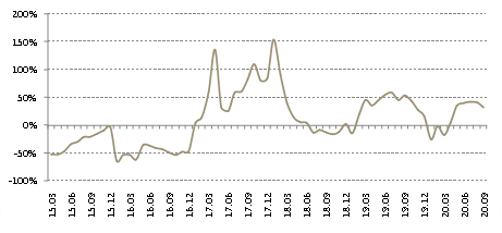 一線城市年初累計居住用地成交面積同比增速