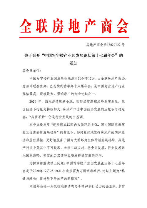 房訊網(wǎng)訊 近日,全聯(lián)房地產(chǎn)商會(huì)發(fā)布《關(guān)于召開(kāi)“中國(guó)寫(xiě)字樓產(chǎn)業(yè)園發(fā)展論壇第十七屆年會(huì)”的通知》,2020年12月25-26日,中國(guó)寫(xiě)字樓產(chǎn)業(yè)園發(fā)展論壇第十七屆年會(huì)定于在北京富力萬(wàn)麗酒店舉行,論壇主題為“重壓與重生:新格局下新商辦的新未來(lái)”。