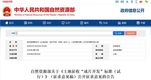 10月21日,自然資源局發(fā)布關(guān)于《土地征收“成片開發(fā)”標(biāo)準(zhǔn)(試行)》(征求意見稿)公開征求意見的公告,對(duì)《土地管理法》中涉及的土地征收“成片開發(fā)”的相關(guān)內(nèi)容進(jìn)行細(xì)化。