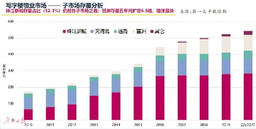 受疫情影響,今年廣州寫字樓市場(chǎng)下半年才開始發(fā)力。隨著珠江新城寫字樓新增供應(yīng)進(jìn)入收官狀態(tài),琶洲和金融城將成為廣州寫字樓的主戰(zhàn)場(chǎng)。進(jìn)入四季度,全市預(yù)計(jì)迎來30.5萬平方米新增供應(yīng)入市,新項(xiàng)目均位于琶洲及國際金融城。仲量聯(lián)行的統(tǒng)計(jì)數(shù)據(jù)顯示,全市未來12個(gè)月預(yù)計(jì)將有超過100萬平方米的甲級(jí)辦公空間進(jìn)入市場(chǎng),其中絕大部分位于琶洲片區(qū)。而第一太平戴維斯研究數(shù)據(jù)顯示,廣州寫字樓市場(chǎng)預(yù)計(jì)于2021年至2022年迎來供應(yīng)高峰,兩年年均供應(yīng)總量將逾百萬平方米。