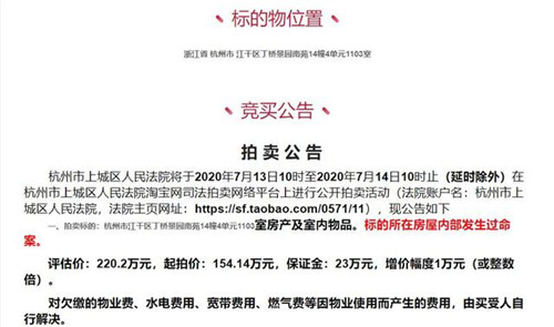 比如,此前,杭州市江干區(qū)丁橋景園南苑成交的一套建筑面積約93平方米的法拍房,獲得5萬人圍觀,最終以總價222萬元成交,這套房子在拍賣公告中就以紅色字體標注房屋內(nèi)部發(fā)生過命案。
