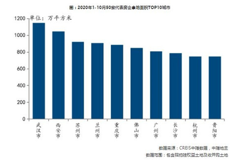 1-10月,在50家代表房企拿地面積TOP10城市中,中西部城市占6席,其中武漢、西安占據(jù)前兩位,蘭州、重慶及長沙也較受歡迎;長三角城市群有兩個(gè)核心城市上榜,蘇州、杭州分別位居第三、九位,較1-9月排名均有提升;粵港澳大灣區(qū)城市群中的佛山和廣州熱度上升,拿地面積位居第六、七位。
