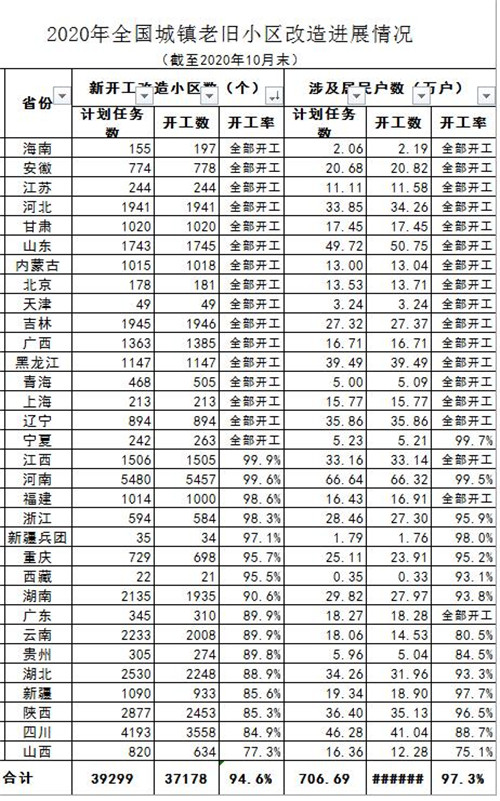 房訊網(wǎng)訊 據(jù)住建部消息,根據(jù)各地上報(bào)數(shù)據(jù),2020年1—10月份,全國新開工改造城鎮(zhèn)老舊小區(qū)3.7萬個(gè),涉及居民687.35萬戶。新開工改造小區(qū)數(shù)已經(jīng)完成年度計(jì)劃任務(wù)的94.6%。