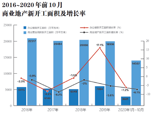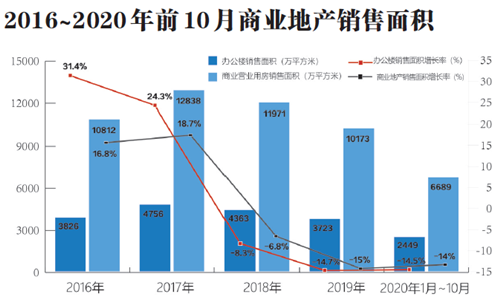 商業(yè)地產(chǎn)銷(xiāo)售方面,在經(jīng)歷了2015年至2017年連續(xù)3年的兩位數(shù)銷(xiāo)售增長(zhǎng)后,2018年商辦物業(yè)市場(chǎng)開(kāi)始出現(xiàn)連續(xù)3年的大幅下滑。2018年、2019年辦公樓銷(xiāo)售面積分別為4363萬(wàn)平方米、3723萬(wàn)平方米,同比分別下滑8.3%和14.7%;商業(yè)營(yíng)業(yè)用房銷(xiāo)售面積分別為11971萬(wàn)平方米和10173萬(wàn)平方米,同比分別下滑6.8%和15%。2020年銷(xiāo)售下滑勢(shì)頭依然不減,前10月辦公樓和商業(yè)營(yíng)業(yè)用房銷(xiāo)售面積僅為2449萬(wàn)平方米和6689萬(wàn)平方米,同比分別下滑14.5%和14%。