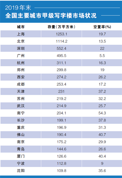 一面是連續(xù)多年的過(guò)度投資開(kāi)發(fā)導(dǎo)致商辦物業(yè)產(chǎn)品過(guò)剩,一面是銷(xiāo)售連年下滑,雙向作用下,商辦物業(yè)空置率大幅提升。據(jù)戴德梁行的統(tǒng)計(jì)數(shù)據(jù),截至2019年末,全國(guó)20個(gè)主要熱點(diǎn)城市甲級(jí)寫(xiě)字樓平均空置率達(dá)到27%。4個(gè)一線城市中,上?罩寐蕿19.7%,北京為13.5%,深圳為22%,廣州為5.5%,除廣州外均明顯偏高。如果說(shuō)基于一線城市人口吸納能力和經(jīng)濟(jì)實(shí)力,四大一線城市空置率尚在可控范圍,相比之下,二線城市空置率則高得有些離譜。圖表中顯示的16個(gè)二線城市平均空置率達(dá)到了30%。除寧波、成都、杭州、鄭州外,空置率均在20%以上,南寧的甲級(jí)寫(xiě)字樓空置率達(dá)到54.3%的高位。而20個(gè)重點(diǎn)城市空置面積總和達(dá)到了6678萬(wàn)平方米。