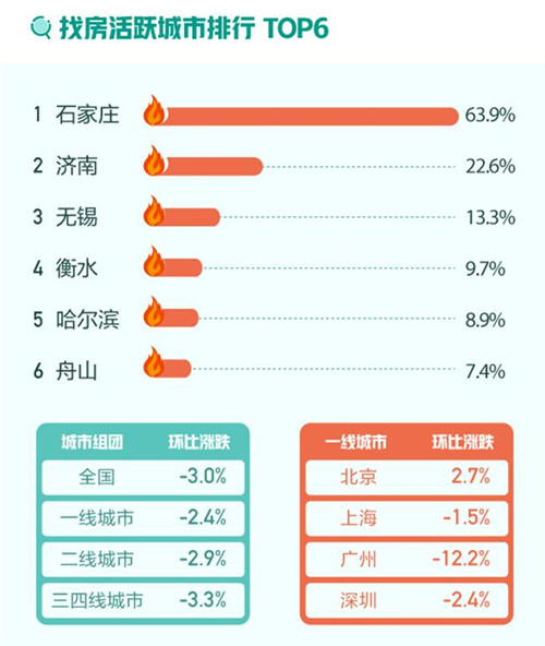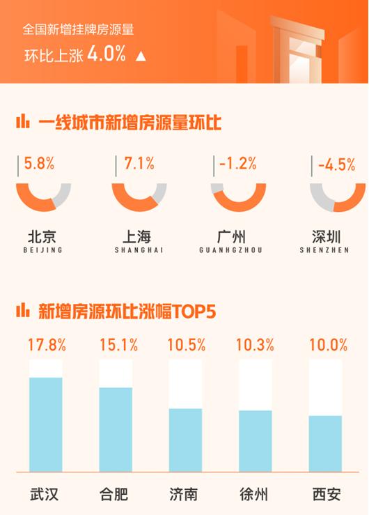 市場(chǎng)供應(yīng)方面,《報(bào)告》顯示全國(guó)新增掛牌房源量環(huán)比上漲4.0%。一線城市中,北京和上海新增掛牌房源量環(huán)比均出現(xiàn)上漲,其中上海環(huán)比漲幅最高達(dá)到7.1%。從全國(guó)范圍來看,武漢、合肥、濟(jì)南、徐州和西安上漲最為明顯,環(huán)比漲幅均超10%。