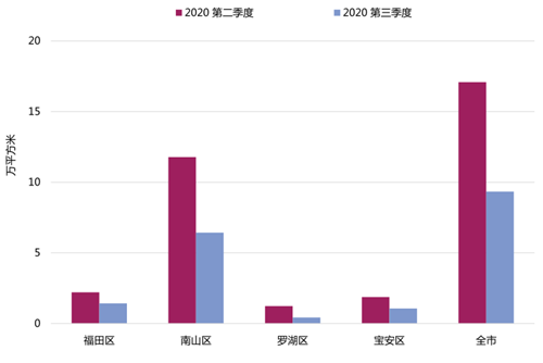 值得注意的是,南山區(qū)內(nèi)TMT行業(yè)集中度高且在疫情期間獲得了新的發(fā)展機(jī)遇,繼續(xù)引領(lǐng)著整體市場。根據(jù)第一太平戴維斯數(shù)據(jù),第三季度,南山區(qū)貢獻(xiàn)了約6.4萬平方米,占全市凈吸納量的68.9%。其中,以科技園和前海最為突出,兩片區(qū)受新興產(chǎn)業(yè)青睞,均有超過2萬平方米的凈吸納量。不過,在子市場需求出現(xiàn)了增長的同時,由于高量供應(yīng)持續(xù)累積,未受疫情影響而顯著放緩,過量供應(yīng)仍是空置率上升主因。季內(nèi),全市平均空置率環(huán)比上升1.6個百分點(diǎn),至29.7%。其中,羅湖區(qū)、安區(qū)季內(nèi)無新增供應(yīng),空置率則環(huán)比回落。