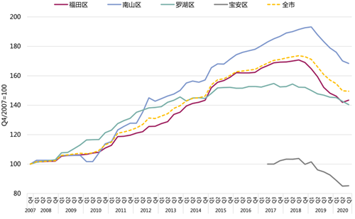 圖3:深圳甲級寫字樓子市場租金指數(shù)對比