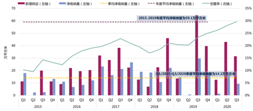 圖1:深圳甲級寫字樓供應(yīng)、凈吸納量及空置率
