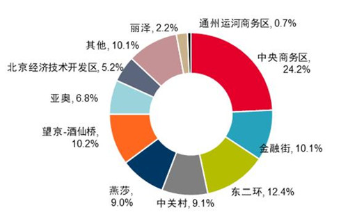 除此之外,中關(guān)村、北京經(jīng)濟(jì)技術(shù)開(kāi)發(fā)區(qū)和通州商圈占全市寫(xiě)字樓市場(chǎng)總存量比分別為9.1%,5.2%和0.7%,這四大商圈共占寫(xiě)字樓總體量的40%。
