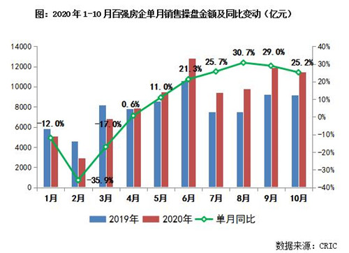 克而瑞研究中心的統(tǒng)計(jì)數(shù)據(jù)顯示,10月,TOP100房企實(shí)現(xiàn)銷售操盤金額11440.7億元,單月業(yè)績同比增長25.2%,環(huán)比下降3.9%。其中,4家龍頭房企銷售環(huán)比增長3.2%,但其余百強(qiáng)銷售業(yè)績環(huán)比下降6.1%。