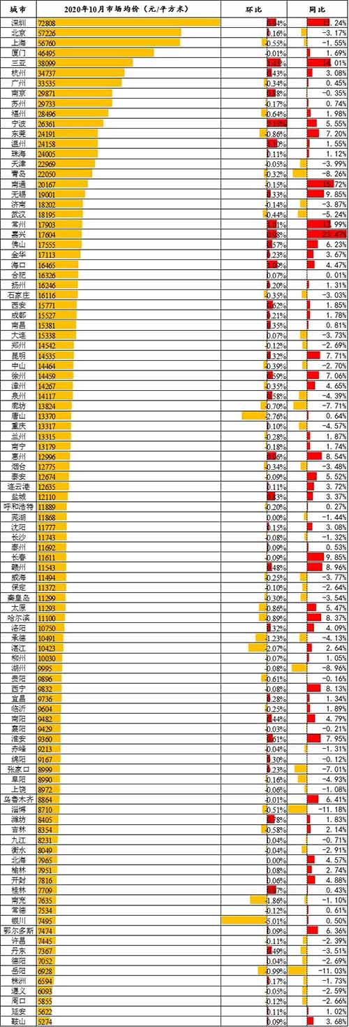 2020年10月百城二手住宅市場均價及同環(huán)比情況 來源:諸葛找房