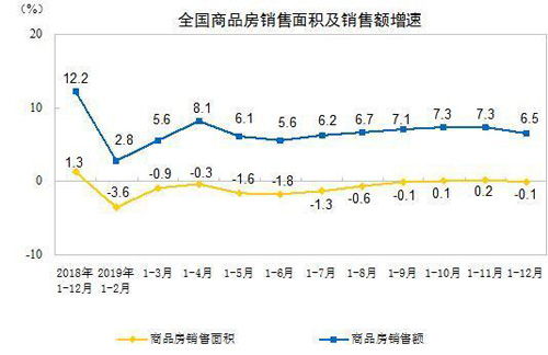 2019年,商品房銷售面積171558萬平方米,比上年下降0.1%,1—11月份為增長(zhǎng)0.2%,上年為增長(zhǎng)1.3%。其中,住宅銷售面積增長(zhǎng)1.5%,辦公樓銷售面積下降14.7%,商業(yè)營(yíng)業(yè)用房銷售面積下降15.0%。商品房銷售額159725億元,增長(zhǎng)6.5%,增速比1—11月份回落0.8個(gè)百分點(diǎn),比上年回落5.7個(gè)百分點(diǎn)。其中,住宅銷售額增長(zhǎng)10.3%,辦公樓銷售額下降15.1%,商業(yè)營(yíng)業(yè)用房銷售額下降16.5%。