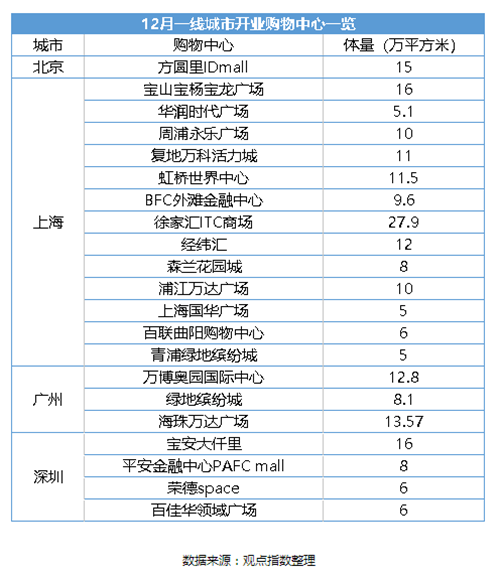 根據(jù)一線城市12月開業(yè)的購物中心(面積均在5萬平方米以上)來看,上海依然占據(jù)數(shù)量第一的位置,月內(nèi)開業(yè)13個購物中心,深圳和廣州月內(nèi)也分別有4個和3個購物中心開業(yè),北京的數(shù)量最少,月內(nèi)僅有1個購物中心開業(yè)。