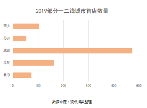 在激烈競爭中,首店經(jīng)濟依然是不少購物中心用于吸引顧客的重要戰(zhàn)略。據(jù)觀點指數(shù)不完全統(tǒng)計,在過去的2019年,我國的部分重要一二線城市均有大量首店業(yè)態(tài)進駐購物中心。其中,成都數(shù)量最多,緊隨其后的是昆明,其次分別是西安、北京、蘇州。