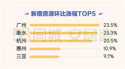 從市場(chǎng)供應(yīng)情況來(lái)看,全國(guó)新增掛牌二手房源量環(huán)比下跌4.1%,一線城市中,廣州新增掛牌量環(huán)比增幅高達(dá)23.5%,排名全國(guó)第一,而北京、上海、深圳新增掛牌量則有所下降。從全國(guó)范圍來(lái)看,衡水、杭州、惠州、三亞新增掛牌房源量環(huán)比均有所上升,衡水僅次于廣州,實(shí)現(xiàn)了23.3%的環(huán)比增幅。
