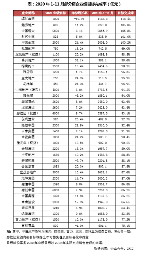 克而瑞統(tǒng)計(jì)顯未,截至11月末,在年內(nèi)設(shè)定了業(yè)績目標(biāo)的36家規(guī)模房企中,超六成房企的目標(biāo)完成率達(dá)到90%以上。其中,恒大、金茂、濱江、越秀、時代5家房企在11月提前超額達(dá)成了全年目標(biāo)。