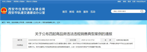 房訊網(wǎng)訊 為進一步促進房地產(chǎn)市場健康平穩(wěn)發(fā)展,近日,西安市住建局公布四起商品房違法違規(guī)銷售典型案例,根據(jù)《關于實行商品房銷售違法違規(guī)行為記分管理的通知》(市房發(fā)〔2017〕64號)要求,西安市不斷加大對商品房違法違規(guī)銷售行為的檢查力度,嚴肅查處房地產(chǎn)開發(fā)企業(yè)違法違規(guī)銷售行為。