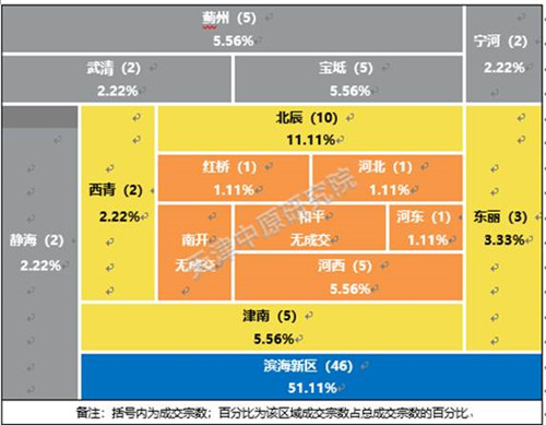 濱海新區(qū)成交土地主要出現(xiàn)在生態(tài)城以及其他產(chǎn)城主題特色鮮明的重點(diǎn)活力區(qū)域。