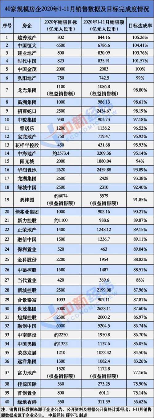 據(jù)統(tǒng)計,截至2020年11月末,在公布2020年業(yè)績目標的40家規(guī)模房企中,已經(jīng)有越秀地產(chǎn)、中國恒大、建業(yè)地產(chǎn)、時代中國、中國金茂5家房企提前完成全年的銷售目標,業(yè)績完成度在90%-100%的房企則有15家。榮盛發(fā)展、遠洋集團、富力地產(chǎn)、佳源國際、首創(chuàng)置業(yè)、綠地香港6家企業(yè)的業(yè)績完成度不足85%,銷售壓力仍存。
