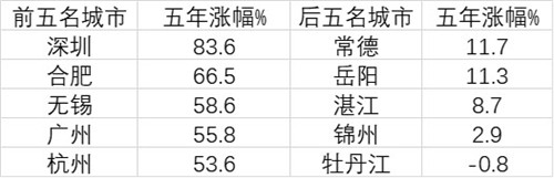 合肥之后,另外一個(gè)長三角城市無錫位列第三。此外,來自長三角的特大城市杭州和南京近五年漲幅也都名列前茅。