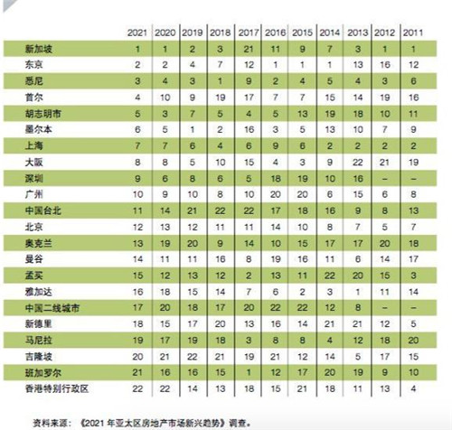 報告指出,2021年亞太地區(qū)最具投資和發(fā)展前景排名前六名的城市分別是新加坡、東京、悉尼、首爾、胡志明市、墨爾本,主要由具有穩(wěn)定和長期前景的大型防御性市場主導(dǎo),去年排名前六的城市中有5座再次躋身2021年投資前景最好的6座城市。而中國的上海、深圳、廣州分別位列第七、第九和第十名。