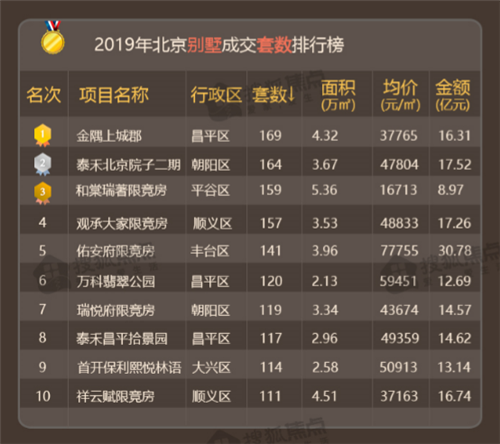 2019年,別墅市場表現(xiàn)不俗,成交4323套,同比增長33.1%,成交均價也由2018年的49546元/平上升到55311元/平,成交套數(shù)排行榜中,占據(jù)前三名的分別是金隅上城郡、泰禾北京院子二期和和棠瑞著限競房,成交套數(shù)分別是169套、164套、159套;而在成交總價上,前三名分別是恒大麗宮、佑安府限競房和景粼原著,銷售金額依次為41.53億元、30.78億元、27.25億元。