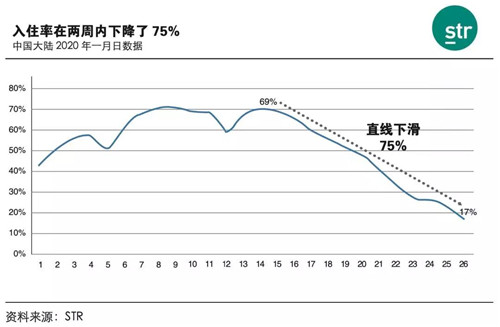 據(jù)STR數(shù)據(jù)顯示,2020年1月初中國大陸地區(qū)的酒店入住率達(dá)到了70%的高點(diǎn),而這一數(shù)據(jù)在一天后開始大幅下跌,到1月26日跌至17%的“冰點(diǎn)”。