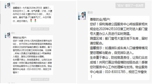 保利資管運營下的保利國際廣場和薊門壹號,對在崗員工進行防疫培訓,不僅設立卡口,嚴格出入測溫登記管控,還對樓宇內(nèi)各重點區(qū)域進行細致的衛(wèi)生清潔、消毒,嚴防死守,將細節(jié)做到極致。同時,對樓宇內(nèi)的客戶,保利資管還進行了復工摸底確認,形成動態(tài)臺帳,提前做好預防疫情準備工作。