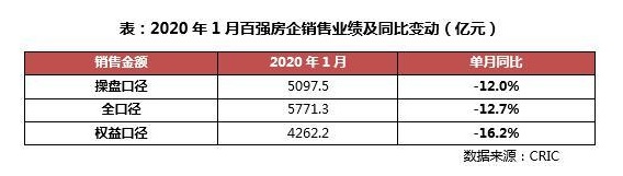 即使是受到疫情沖擊較小的1月份,多數(shù)房企的銷售業(yè)績也表現(xiàn)低迷。克而瑞數(shù)據(jù)顯示,今年1月百強(qiáng)房企實(shí)現(xiàn)操盤口徑銷售金額5097.05億元,整體業(yè)績規(guī)模較去年同期降低近12%。