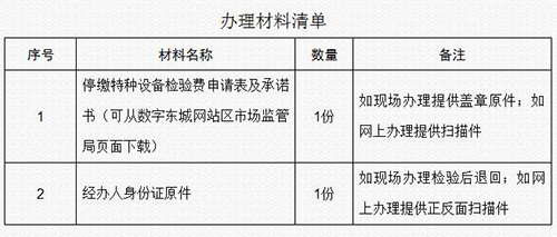 辦理方式:(1)網(wǎng)上辦理。將辦理材料的電子版(掃描或照片均可)發(fā)至特種設(shè)備檢驗(yàn)機(jī)構(gòu)受理信箱(dcjtjs@scjgj.beijing.gov.cn),由檢驗(yàn)機(jī)構(gòu)審核通過后,即可停征。