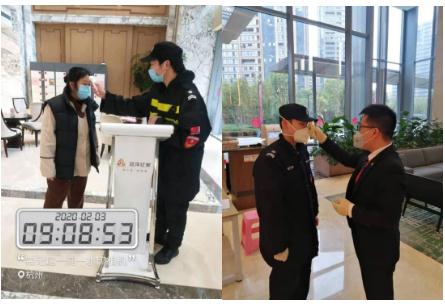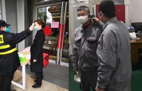 同時我們對大廈入口進行管控,關閉部分通道,僅留一個人行入口。門口設有測溫站點,超過37.3度人員禁止進入。