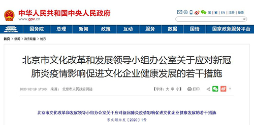 房訊網(wǎng)訊 2月19日,北京市文化改革和發(fā)展領(lǐng)導(dǎo)小組辦公室發(fā)布《關(guān)于應(yīng)對新冠肺炎疫情影響促進(jìn)文化企業(yè)健康發(fā)展的若干措施》,進(jìn)一步減輕疫情對首都文化企業(yè)生產(chǎn)經(jīng)營影響。
