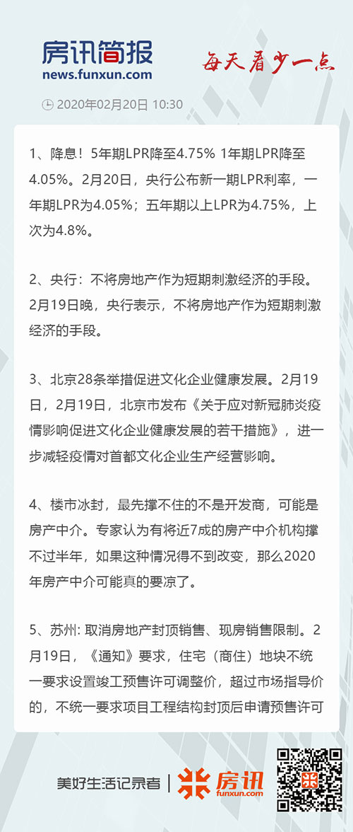 ●降息!5年期LPR降至4.75% 1年期LPR降至4.05%。2月20日,央行公布新一期LPR利率,一年期LPR為4.05%;五年期以上LPR為4.75%,上次為4.8%。業(yè)內(nèi)分析認為,年初處于信貸投放高峰期,此時LPR下降,進而引導(dǎo)貸款利率下降,對于降成本、穩(wěn)增長具有積極意義。