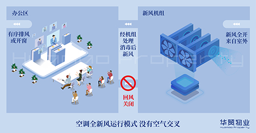 疫情防控期間,大廈工程人員對寫字樓VAV空調(diào)通風(fēng)系統(tǒng)運(yùn)行模式進(jìn)行調(diào)整,在保證室內(nèi)溫度合適的情況下,關(guān)閉新風(fēng)回風(fēng)系統(tǒng),并增大新風(fēng)風(fēng)量,保證每戶企業(yè)室內(nèi)空氣質(zhì)量,杜絕空氣交叉感染。