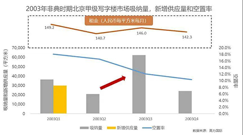 針對北京的甲級寫字樓租賃市場來看,此次疫情對于寫字樓租賃市場的影響可以借鑒2003年SARS的影響,但我們的基本判斷是疫情對于整體市場并沒有決定性影響,其影響更多是在市場參與者的活躍度和市場節(jié)奏變化而已;仡2003年非典時期北京寫字樓市場,當時的北京市場甲級寫字樓市場存量規(guī)模也就150多萬平米,和現(xiàn)在近千萬平米的市場規(guī)模顯然不是一個量級。