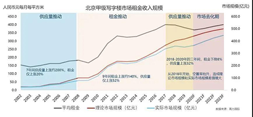 第三,2020年是北京寫字樓未來4到5年內(nèi)最后一個供應高峰。從2002年到2020年,北京甲級寫字樓市場增長規(guī)模一共經(jīng)歷了3個時期:2002-2008年的供應量推動期,2009-2017年的租金推動期,2018年到2020年的第二個供應推動期。從2021年開始,整體市場隨著第二輪供應高峰的結束將進入一輪3-4年左右的市場去化周期,整體甲級寫字樓市場租金收入規(guī)模依然會持續(xù)攀升。