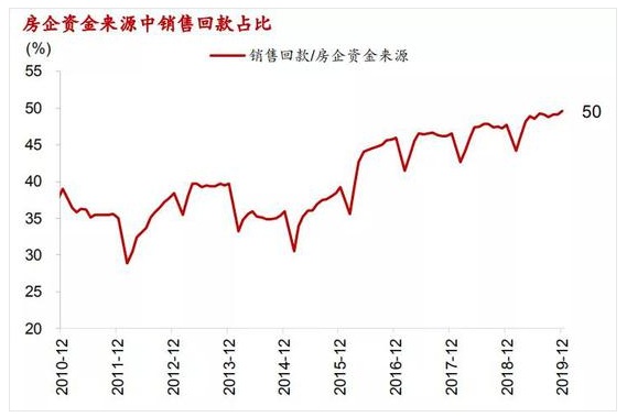 銷售下滑對房企資本開支造成拖累。當商品房銷售金額增速回落時,房企的投資決策將趨于謹慎,投資速度亦趨于下降。這是因為銷售回款是房企資金來源的“主動脈”。房企普遍具有高杠桿的特征,2019年三季度,A股上市房企的資產(chǎn)負債率(總資產(chǎn)/總負債)高達80.6%,僅次于金融業(yè),這使得現(xiàn)金流成為了房企的生命線。而在在房地產(chǎn)調(diào)控政策持續(xù)收緊影響下,銀行貸款與信托融資來源大幅收緊,銷售回款對于房企的重要性日趨上升,目前占比已達50%,是房企資金來源中的最大項。
