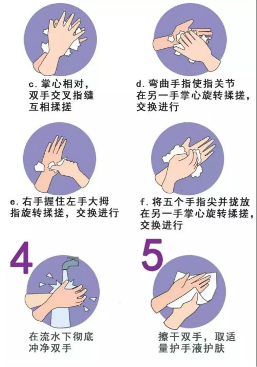 正確的洗手方法是個人良好衛(wèi)生習(xí)慣重要內(nèi)容之一,能有效的防止新型冠狀病毒的傳播。在與患者接觸后,觸摸眼、口、鼻前,打噴嚏或咳嗽后,如廁后,帶口罩前及摘口罩后,接觸公共設(shè)施如扶手、門柄、電梯按鈕、公共電話后、從外面回家后等均應(yīng)及時洗手。