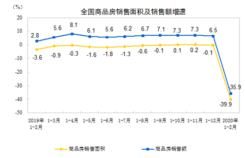 房訊網(wǎng)訊 據(jù)國家統(tǒng)計局數(shù)據(jù),1—2月份,商品房銷售面積8475萬平方米,同比下降39.9%。其中,住宅銷售面積下降39.2%,辦公樓銷售面積下降48.4%,商業(yè)營業(yè)用房銷售面積下降46.0%。商品房銷售額8203億元,下降35.9%。其中,住宅銷售額下降34.7%,辦公樓銷售額下降40.6%,商業(yè)營業(yè)用房銷售額下降46.0%。