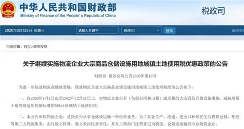公告明確,自2020年1月1日起至2022年12月31日止,對物流企業(yè)自有(包括自用和出租)或承租的大宗商品倉儲設(shè)施用地,減按所屬土地等級適用稅額標(biāo)準(zhǔn)的50%計征城鎮(zhèn)土地使用稅。