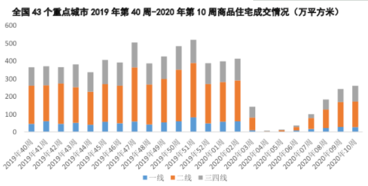 分能級(jí)來(lái)看,一、二、三四線城市最近一周商品住宅成交量分別達(dá)到去年四季度周均成交量的53%、64%、70%,換言之,目前三四線樓市整體復(fù)蘇程度最高,二線次之,一線城市最低。
