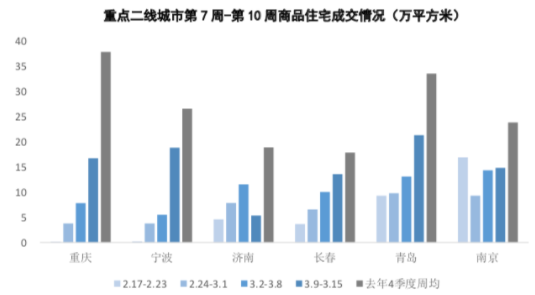 隨著新冠肺炎疫情在國(guó)內(nèi)得到有效控制,2月下旬以來(lái),多市住建局相繼發(fā)布通知,著力推動(dòng)房企復(fù)工復(fù)產(chǎn)、推進(jìn)售樓處安全有序開(kāi)放。目前,全國(guó)樓市整體呈現(xiàn)穩(wěn)步復(fù)蘇態(tài)勢(shì), 重點(diǎn)城市商品住宅成交量逐步回升,第十周(3.9-3.15),全國(guó)43個(gè)重點(diǎn)監(jiān)測(cè)城市商品住宅成交面積達(dá)到259萬(wàn)平方米,環(huán)比上周增長(zhǎng)7%,相較第七周增長(zhǎng)159%,基本恢復(fù)至去年四季度周均成交量的6成水平。