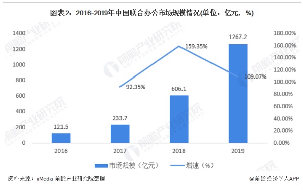 我國(guó)聯(lián)合辦公市場(chǎng)高速發(fā)展,2019年聯(lián)合辦公市場(chǎng)規(guī)模達(dá)1267.2億元