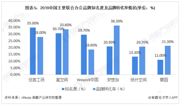 圖表5:2019中國(guó)主要聯(lián)合辦公品牌知名度及品牌轉(zhuǎn)化率情況(單位:%)