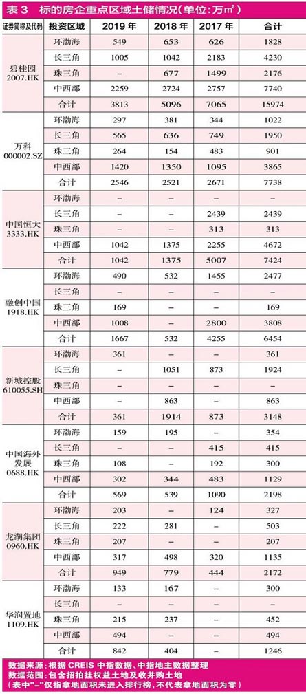 而從標的房企在長三角、珠三角、環(huán)渤海、中西部等重點區(qū)域的土儲布局(見表3)來看,除了“碧萬恒融”重倉上述核心城市群之外,新城控股、中海地產(chǎn)、華潤置地、龍湖集團在上述重點區(qū)域的土儲規(guī)模也較大。優(yōu)質的土儲布局,為上述房企日后的銷售業(yè)績奠定了豐厚的基礎。