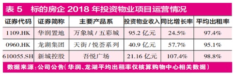 《紅周刊》梳理標的房企財務數(shù)據(jù)發(fā)現(xiàn)(見表5),在投資物業(yè)擁有特色IP的房企中,華潤置地、龍湖集團、新城控股表現(xiàn)亮眼。其中,華潤置地的投資物業(yè)收入規(guī)模最高,2018年和2019年上半年分別達到95.2億元和57億元,較去年同期增長24.5%和30.4%。在華潤上述收入規(guī)模中占比最大的購物中心各產(chǎn)品系,在2018年的平均出租率高達97.4%。