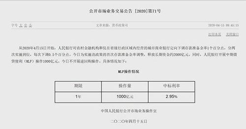 3月31日,央行調(diào)降7天期逆回購利率20個基點(diǎn),此次央行開展MLF操作也迎來同等幅度“降息”。